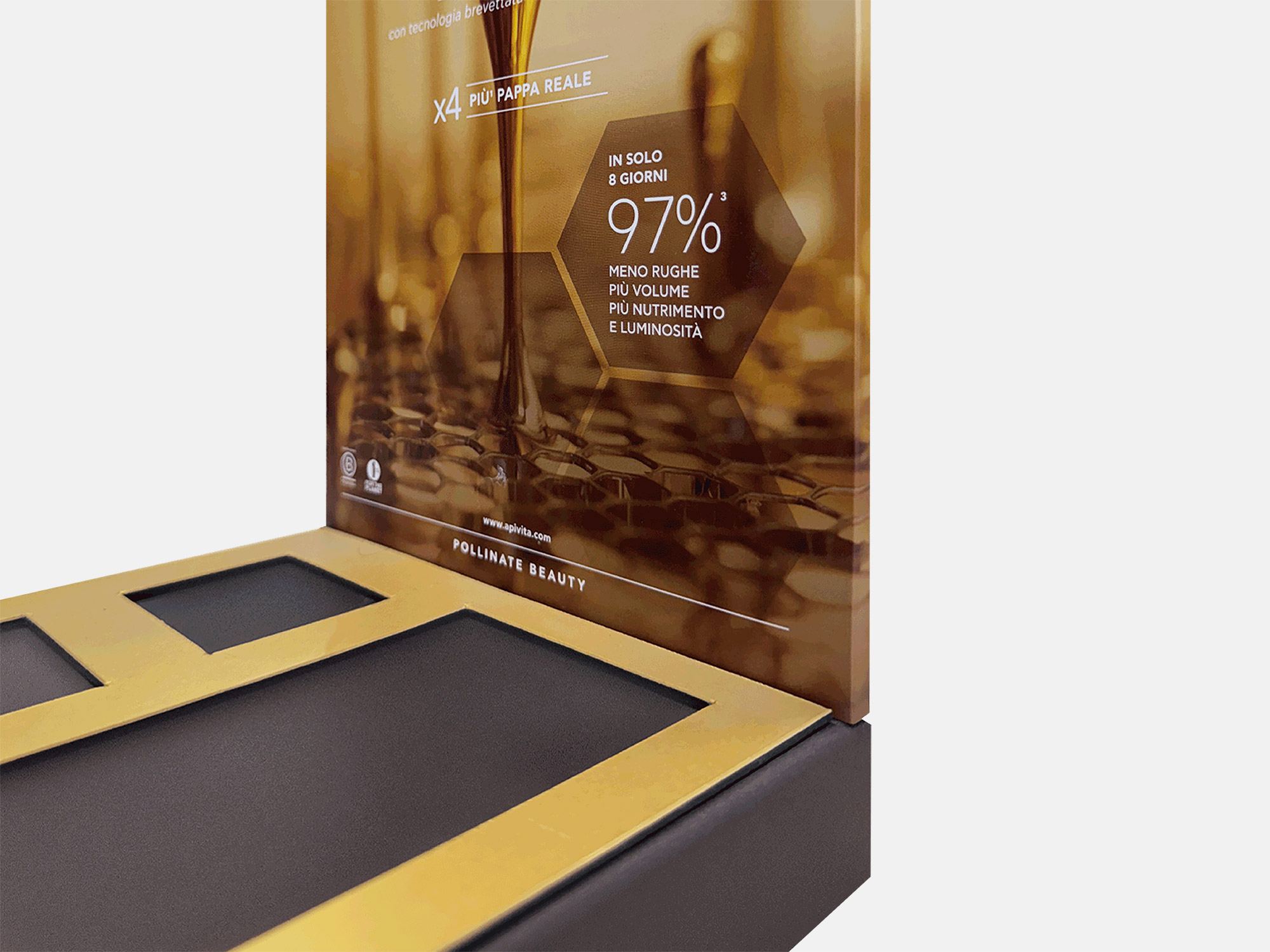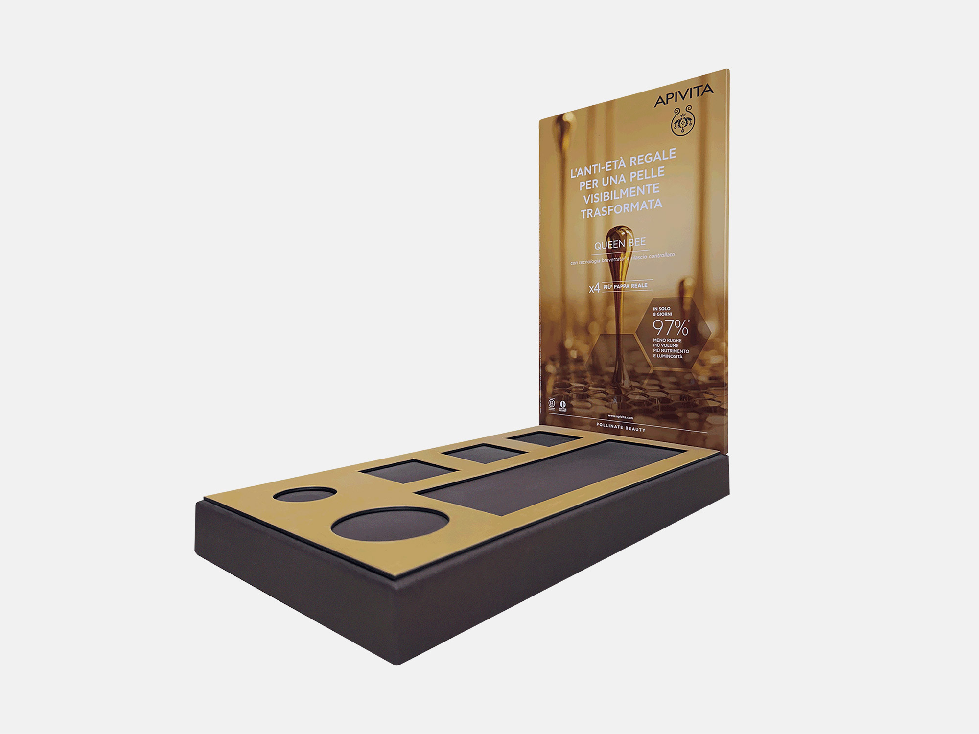 Επιτραπέζιο σταντ APIVITA QUEEN BEE APIVITA QUEEN BEE APIVITA QUEEN BEE APIVITA QUEEN BEE APIVITA QUEEN BEE Επιτραπέζιο σταντ από χαρτόνι επενδυμένο με Curious Metallics Chocolate, βάση στήριξης επενδυμένη με Sirio Pearl Aurum και μετόπη επενδυμένη με S.Fine και ματ πλαστικοποίηση. ΠΕΡΙΣΣΟΤΕΡΑ Printing CMYK Industrial Design La Petite Jumelle Graphic Design APIVITA FBLIPIMail FBLIPIMail ΠΙΣΩ