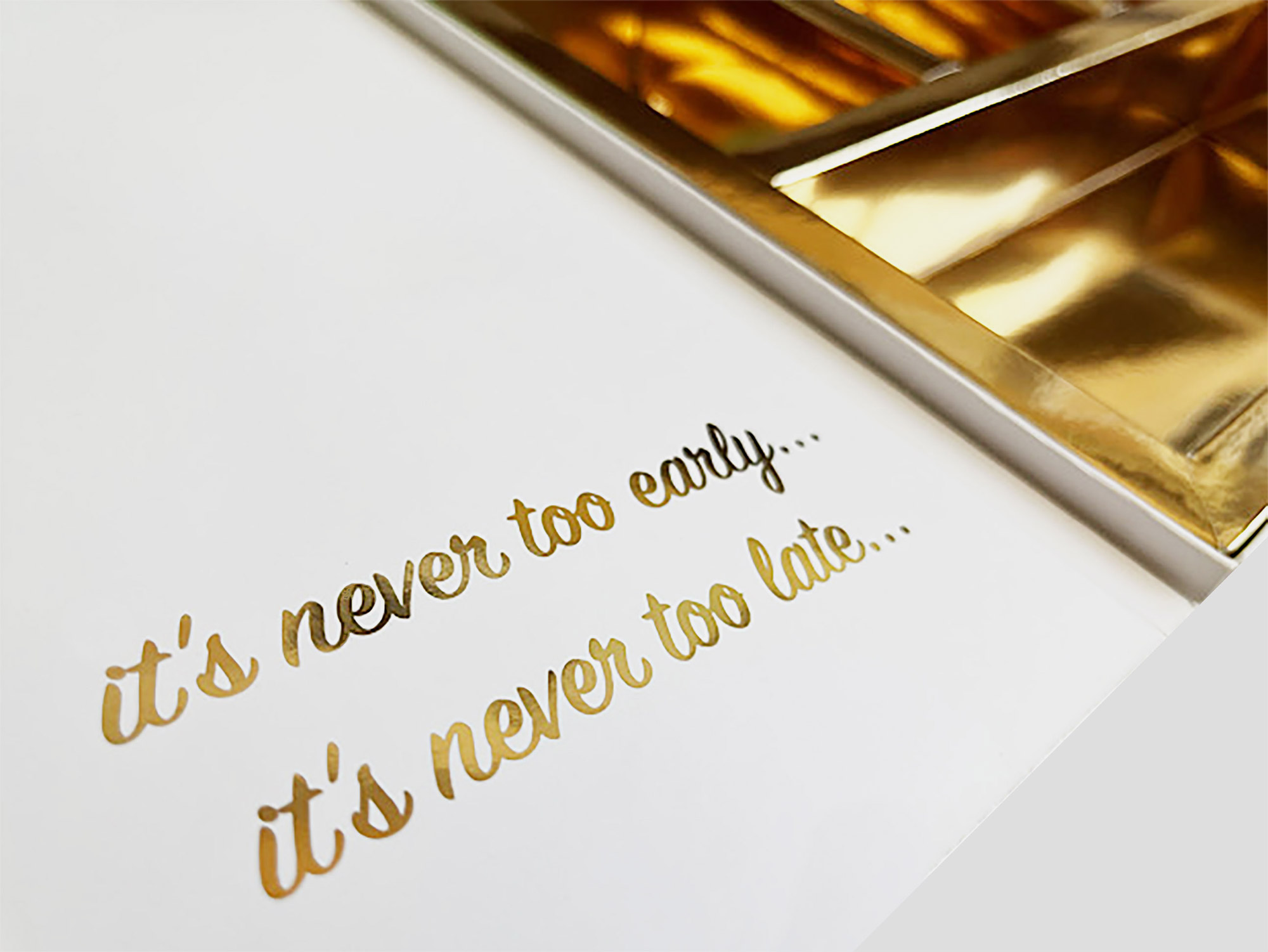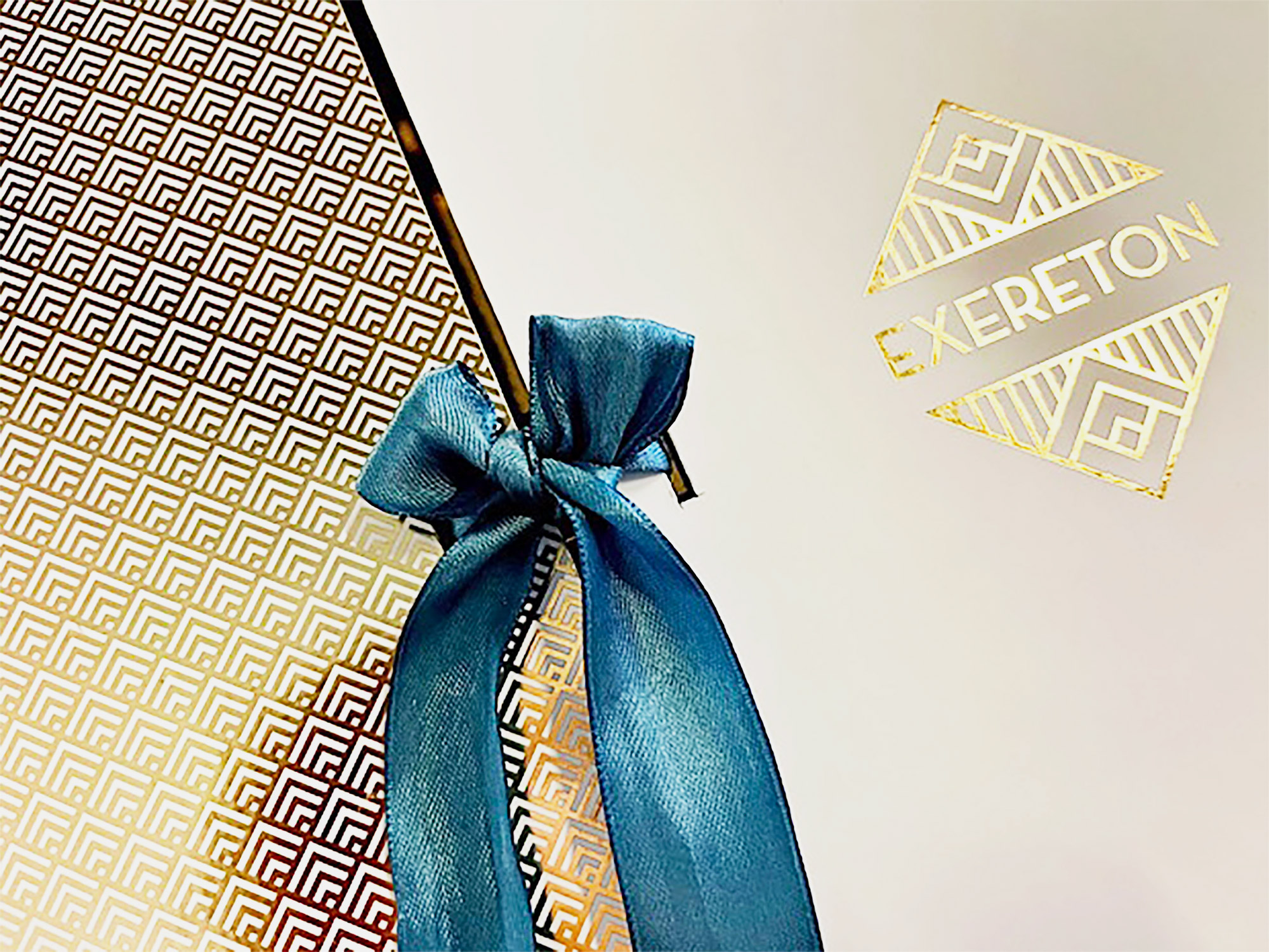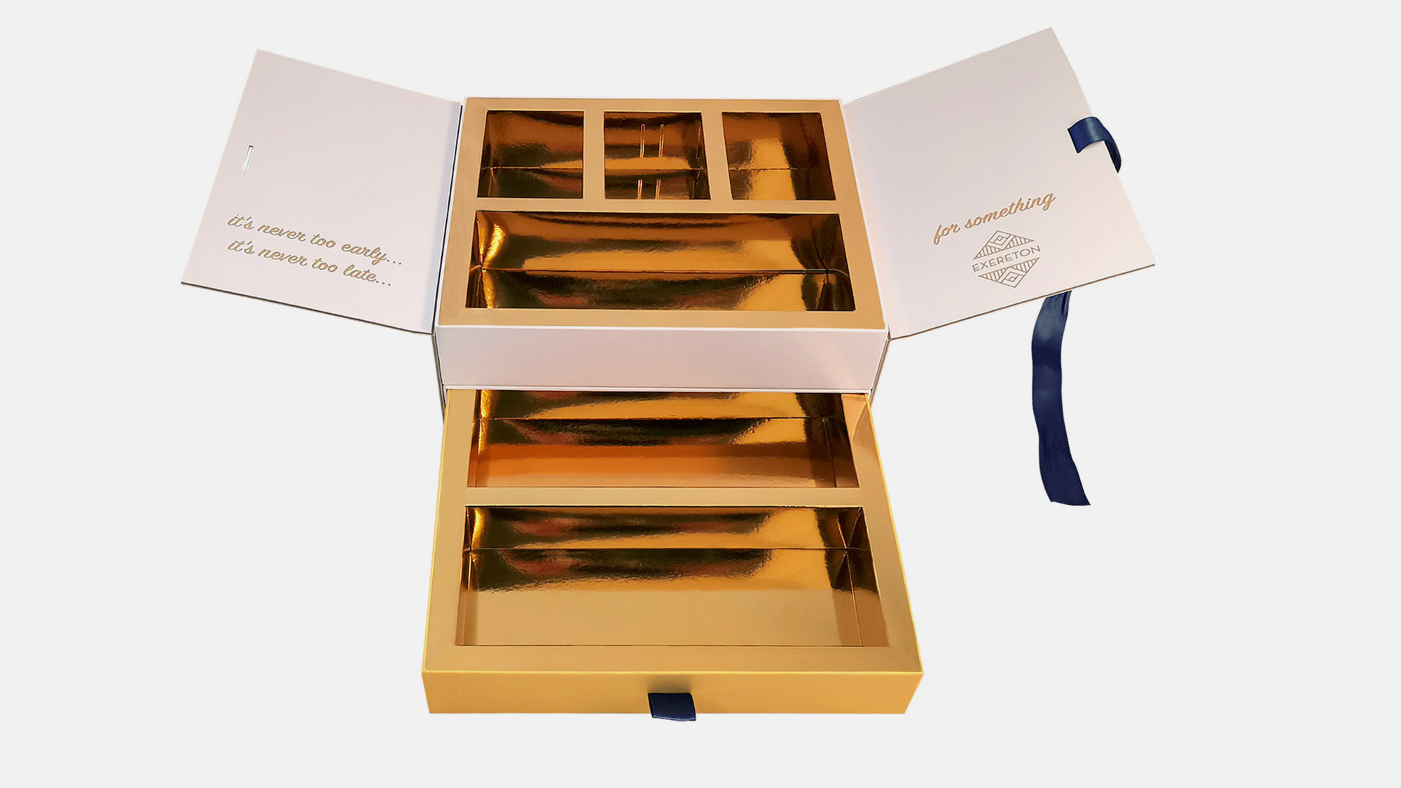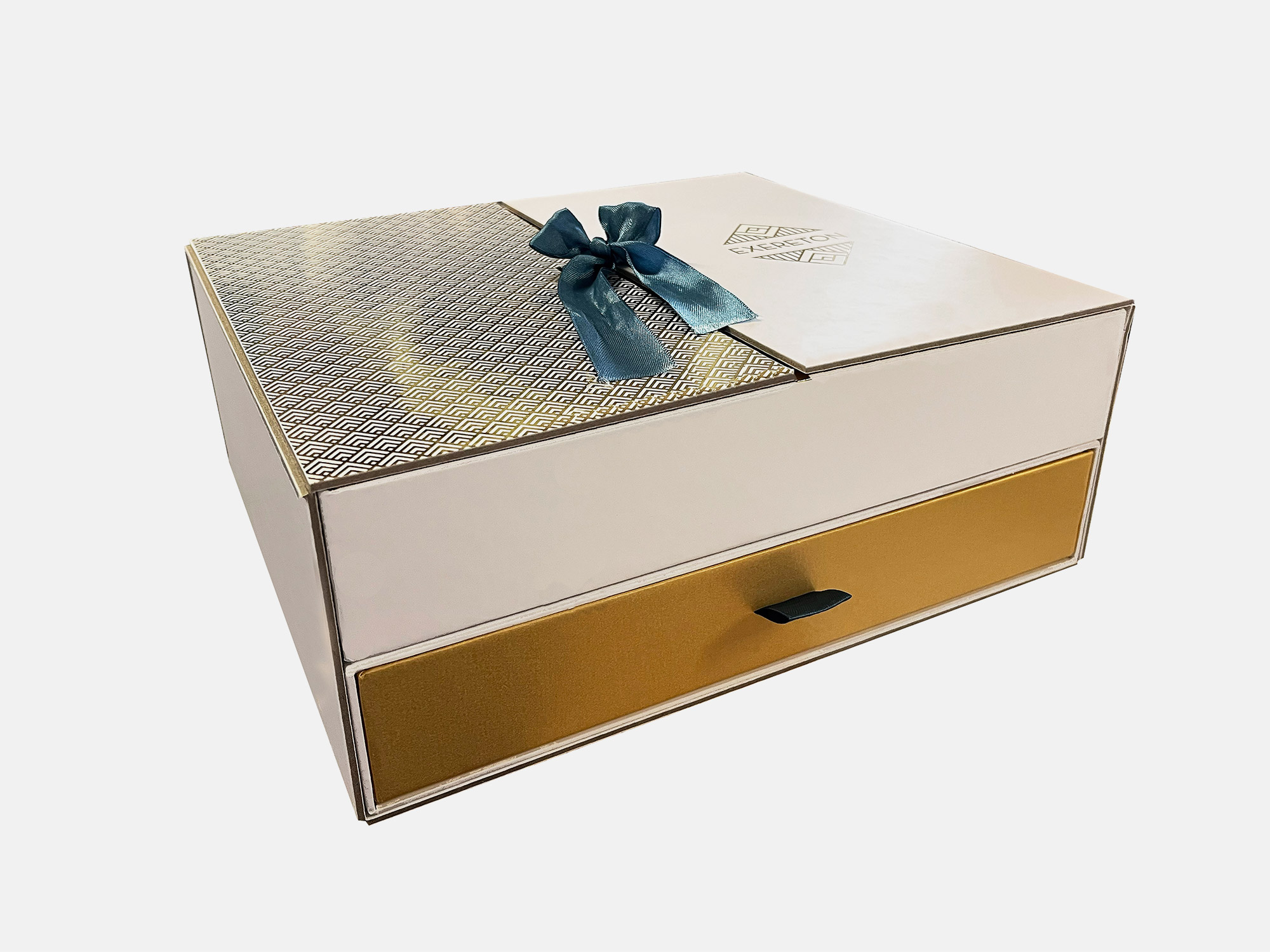 Πολυτελές κουτί με 4πτυχο ταμπλό από σκληρό χαρτόνι επενδυμένο με Velvet και κλείσιμο κορδέλα. Εσωτερική θήκη με διαχωριστικά επενδυμένη με χρυσό πολυεστέρα. Συρτάρι με κορδέλα επενδυμένο εσωτερικά με χρυσό πολυεστέρα και εξωτερικά με Stardream Gold.