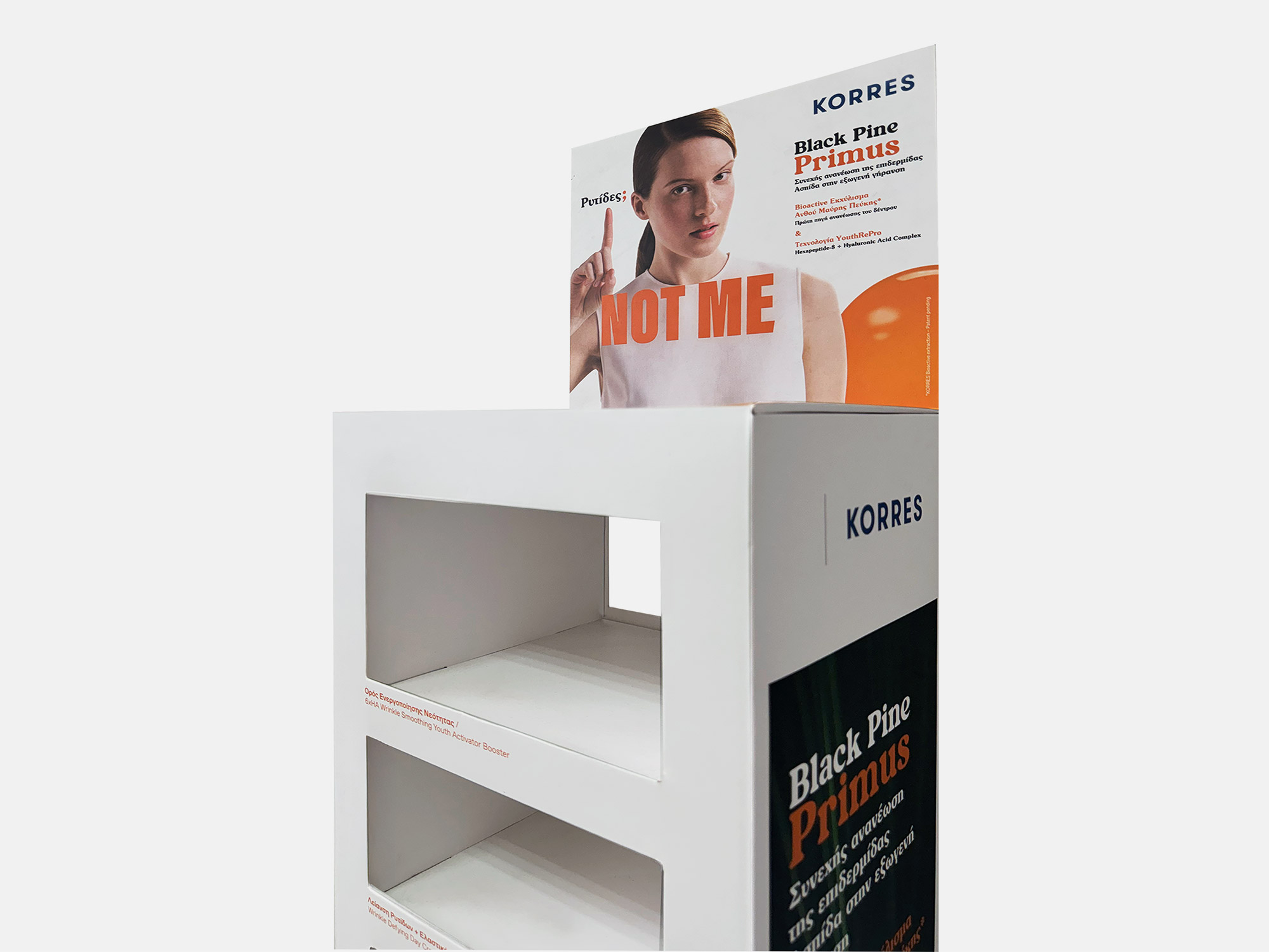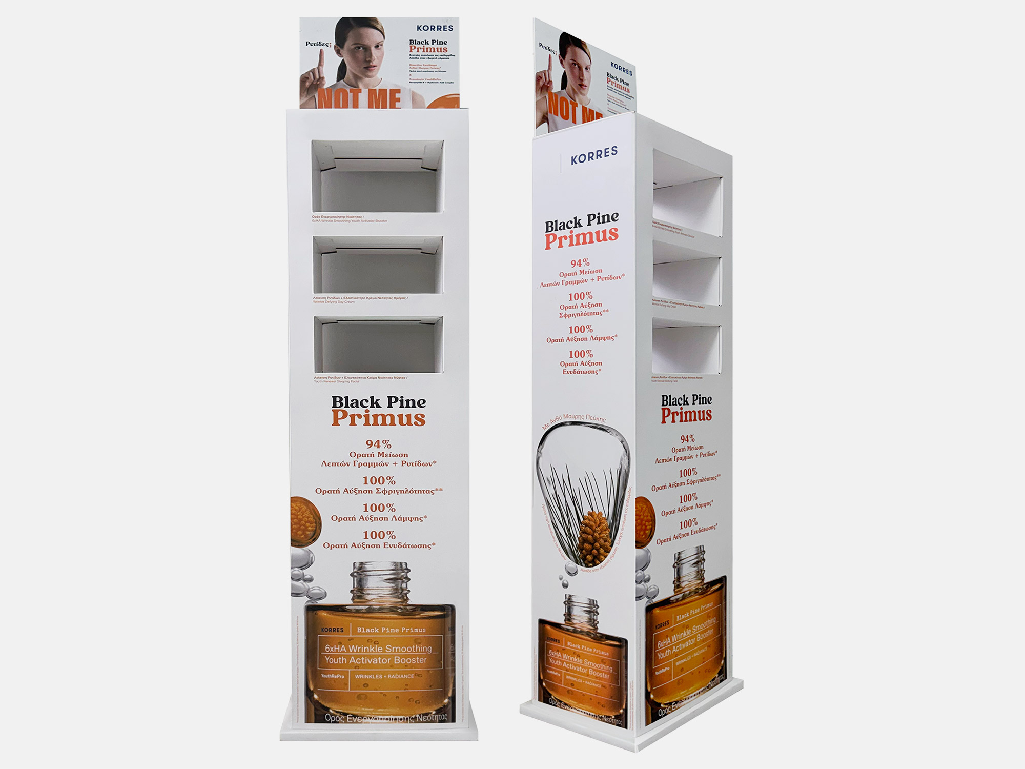 Επιδαπέδιο σταντ KORRES BLACK PINE PRIMUS KORRES BLACK PINE PRIMUS KORRES BLACK PINE PRIMUS KORRES BLACK PINE PRIMUS KORRES BLACK PINE PRIMUS Σταντ με υποδοχές για τα προϊόντα, κατασκευασμένο από E-flute επενδυμένο με S.Fine και ματ πλαστικοποίηση. ΠΕΡΙΣΣΟΤΕΡΑ Printing CMYK Industrial Design The Backyard Lab Graphic Design The Backyard Lab Client KORRES FBLIPIMail FBLIPIMail ΠΙΣΩ