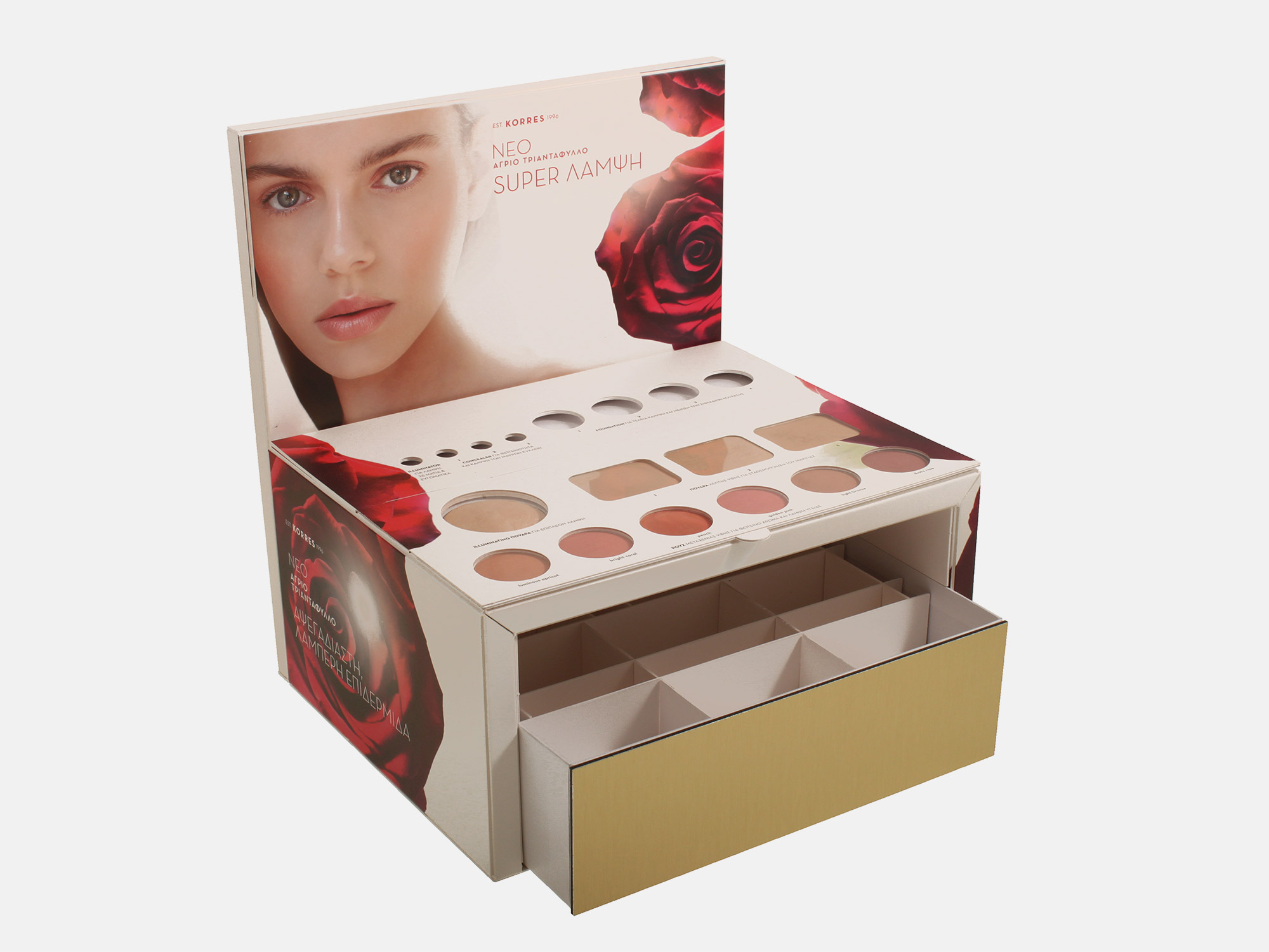 Επιτραπέζιο σταντ KORRES WILD ROSE eyeshadows KORRES WILD ROSE eyeshadows KORRES WILD ROSE eyeshadows KORRES WILD ROSE eyeshadows KORRES WILD ROSE eyeshadows Πολυτελές desk stand για καλλυντικά κατασκευασμένο από λευκό χαρτόνι . Συρτάρι με καπάκι και διακόσμηση dibond. ΠΕΡΙΣΣΟΤΕΡΑ Printing Offset Spot UV ματ πλαστικοποίηση Industrial Design The Backyard Lab Graphic Design The Backyard Lab Client KORRES Βραβεία Packaging Awards FBLIPIMail FBLIPIMail ΠΙΣΩ