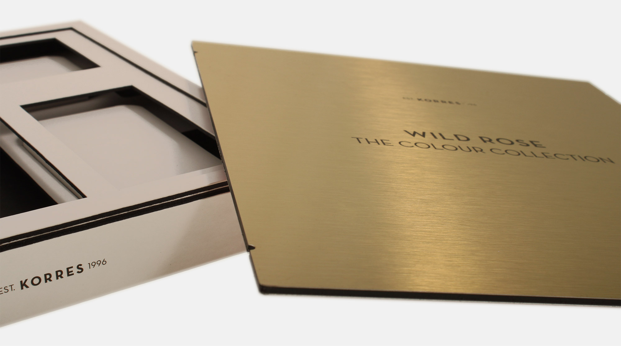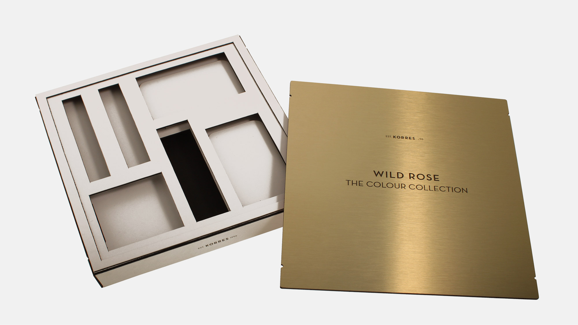 Σκληρό κουτί επενδυμένο με S.Fine και καπάκι κατασκευασμένο από χρυσό dibond που κλείνει με λάστιχα.