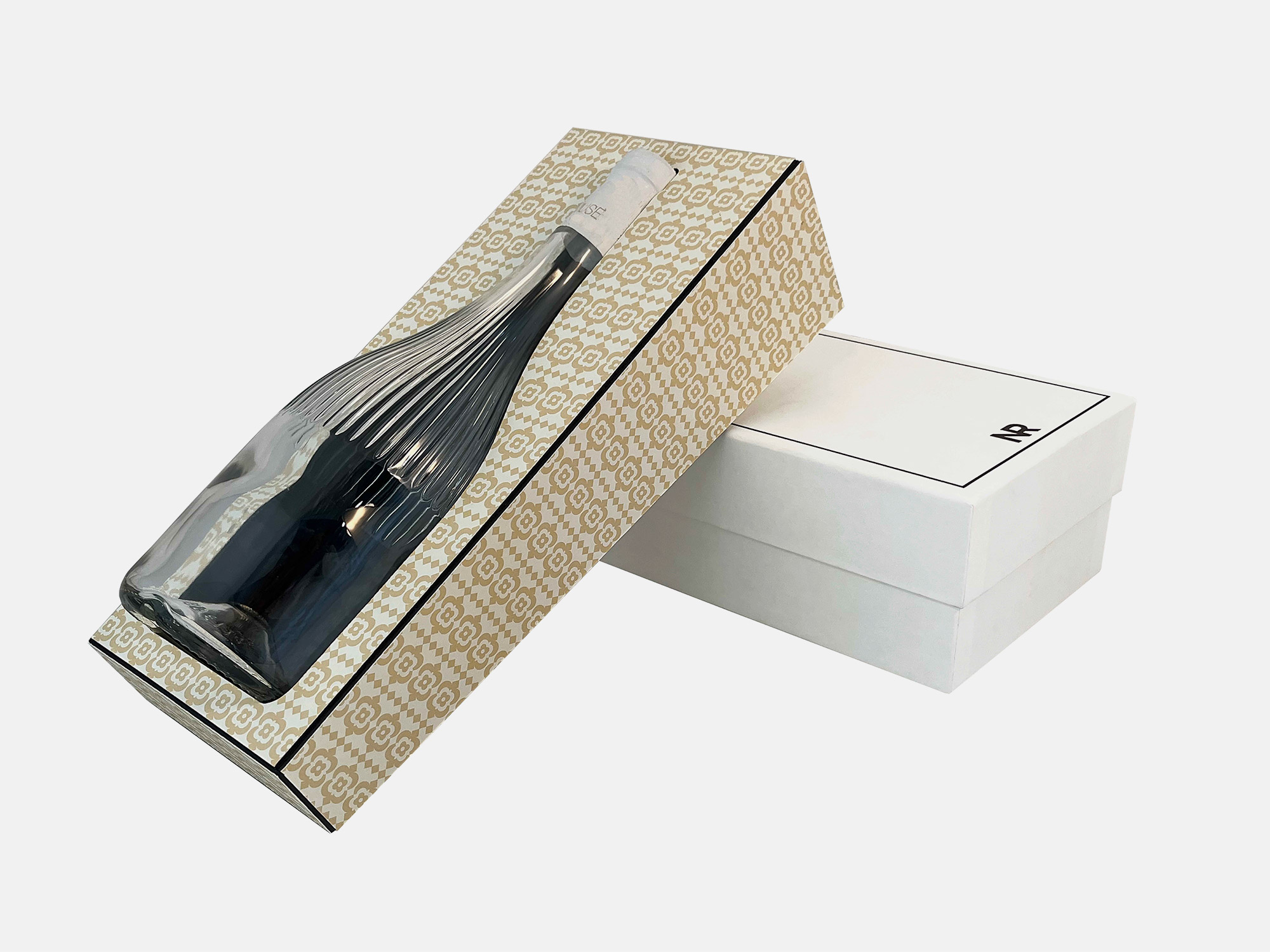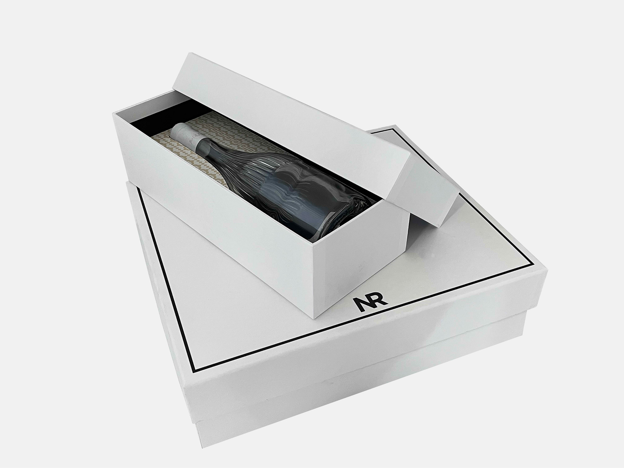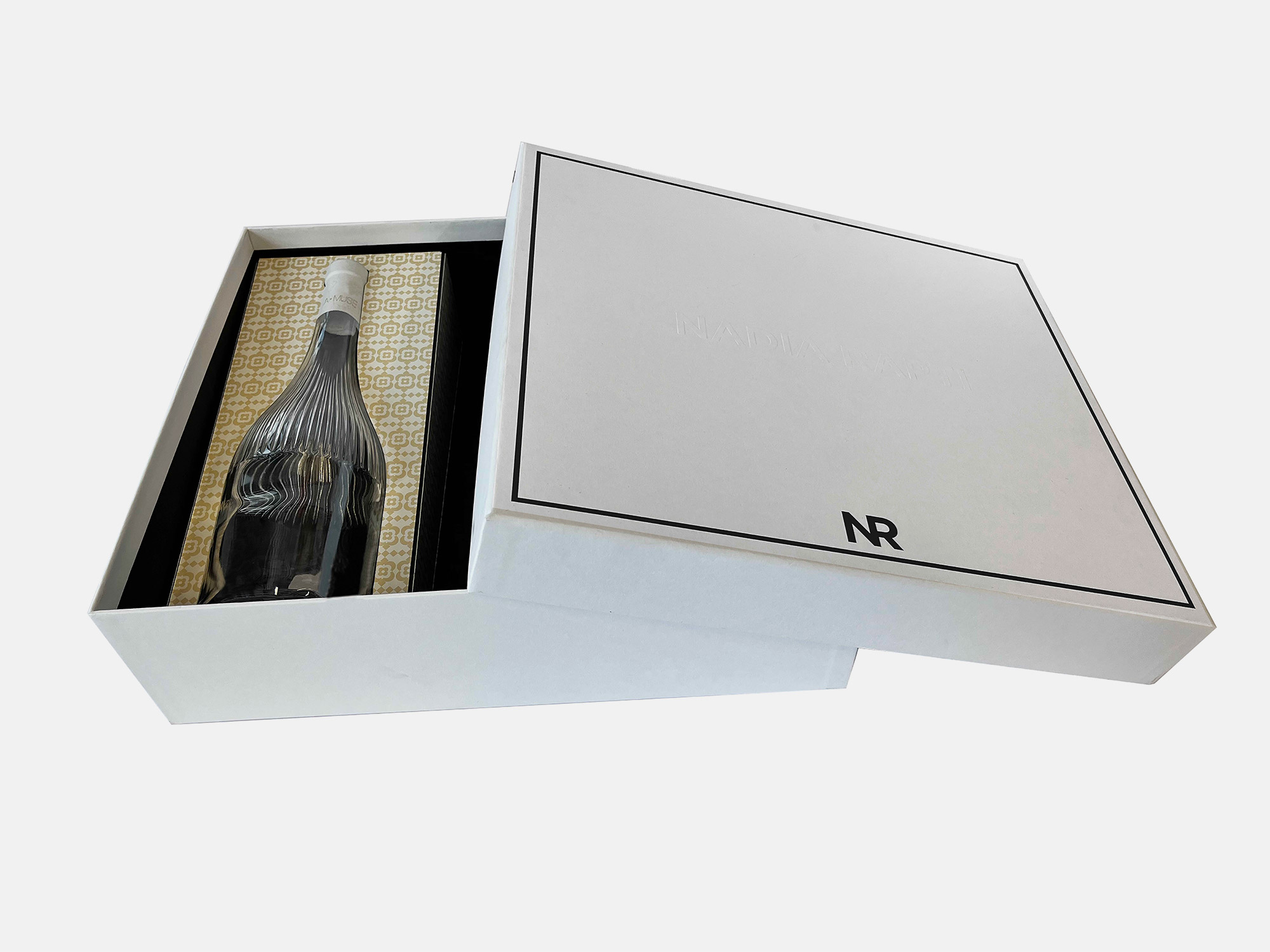 Kουτιά αποτελούμενα από δύο μέρη. Σε δύο μεγέθη για κρασί και ενδύματα από σκληρό χαρτόνι επενδυμένα με Old Mill Bianco και ανάγλυφο. Περιλαμβάνεται βάση στήριξης για το μπουκάλι επενδυμένη με Old Mill Avorio.