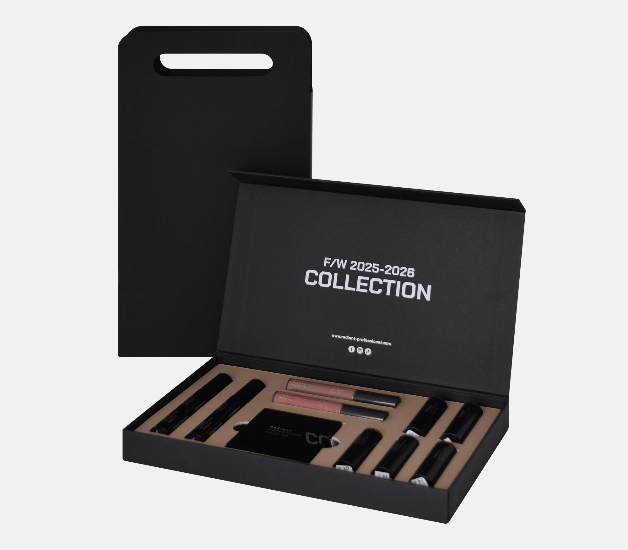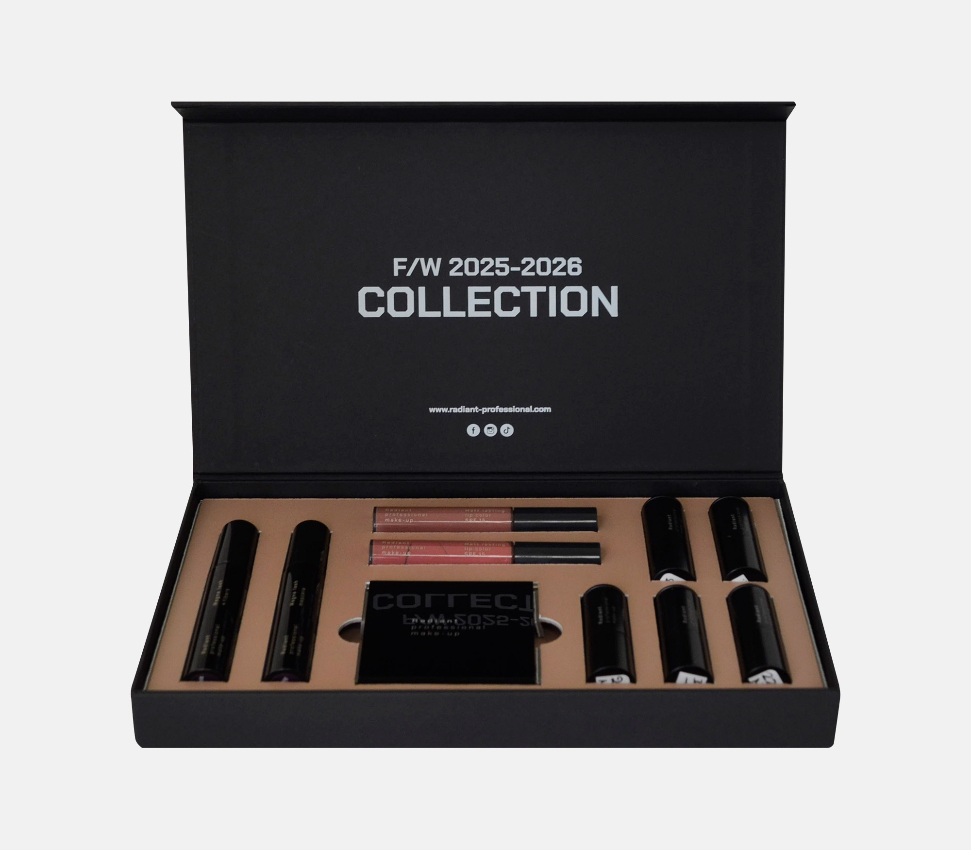 Press Kit RADIANT F/W 2025-2026 RADIANT F/W 2025-2026 RADIANT F/W 2025-2026 RADIANT F/W 2025-2026 RADIANT F/W 2025-2026 Κουτί με ταμπλό επενδυμένο με Sirio Black, κλείσιμο μαγνήτη και εσωτερική βάση στήριξης με custom εγκοπές. ΠΕΡΙΣΣΟΤΕΡΑ Printing 1 Pantone λευκή θερμοτυπία Industrial Design La Petite Jumelle Client hellenica FBLIPIMail FBLIPIMail ΠΙΣΩ