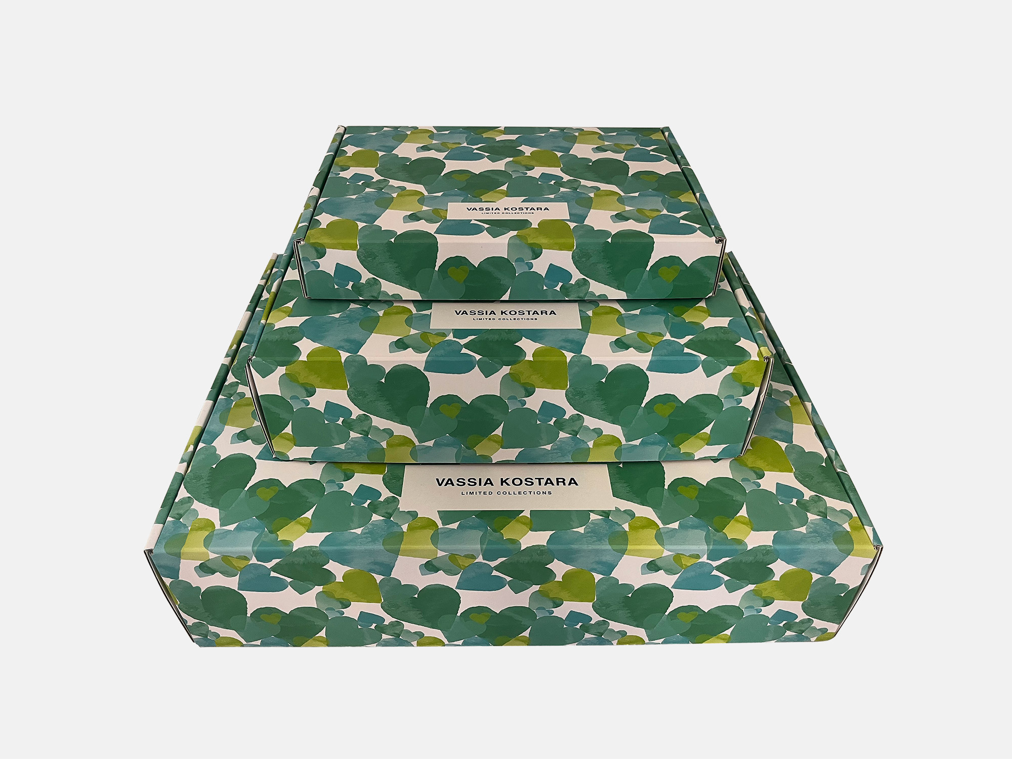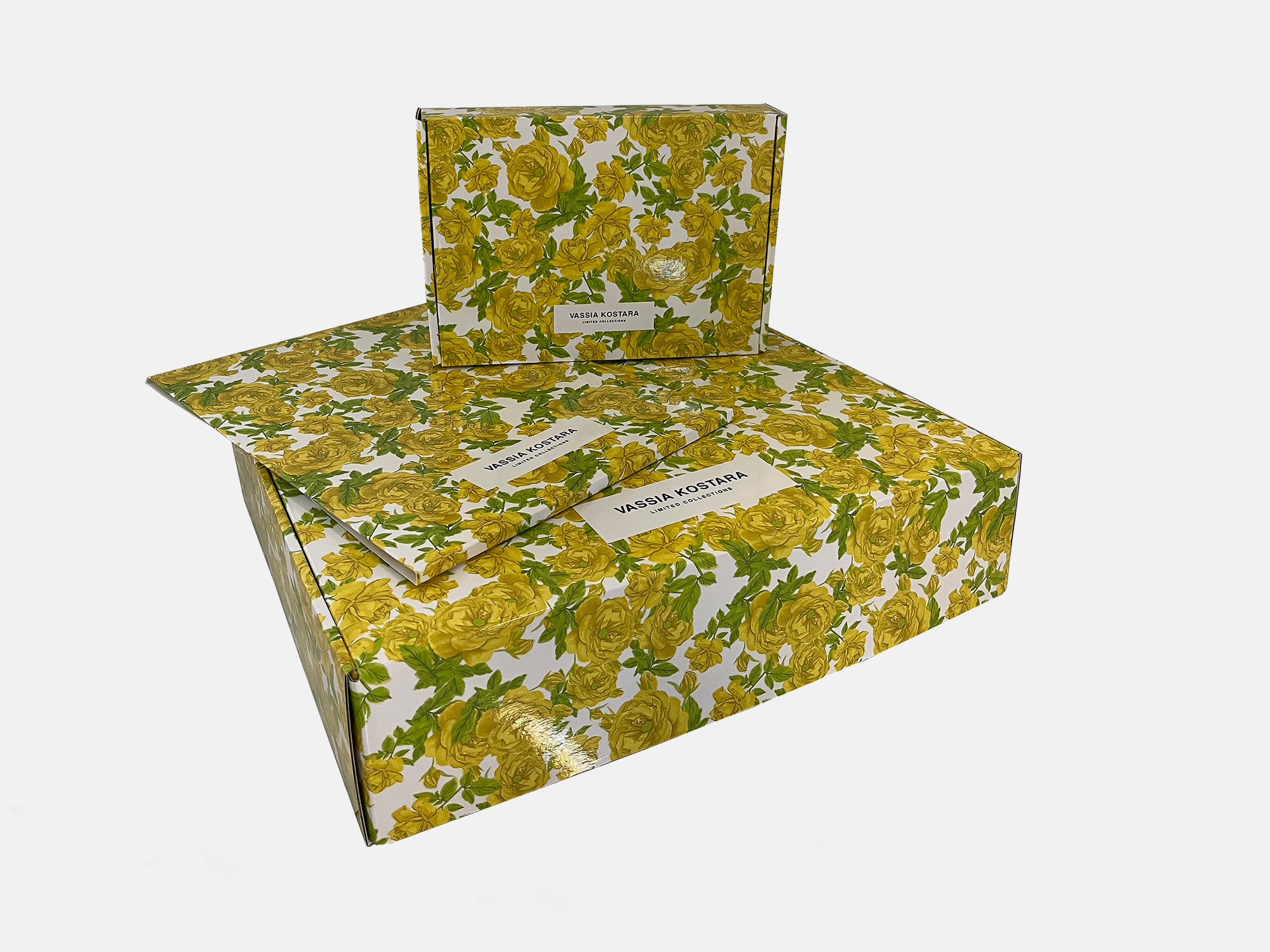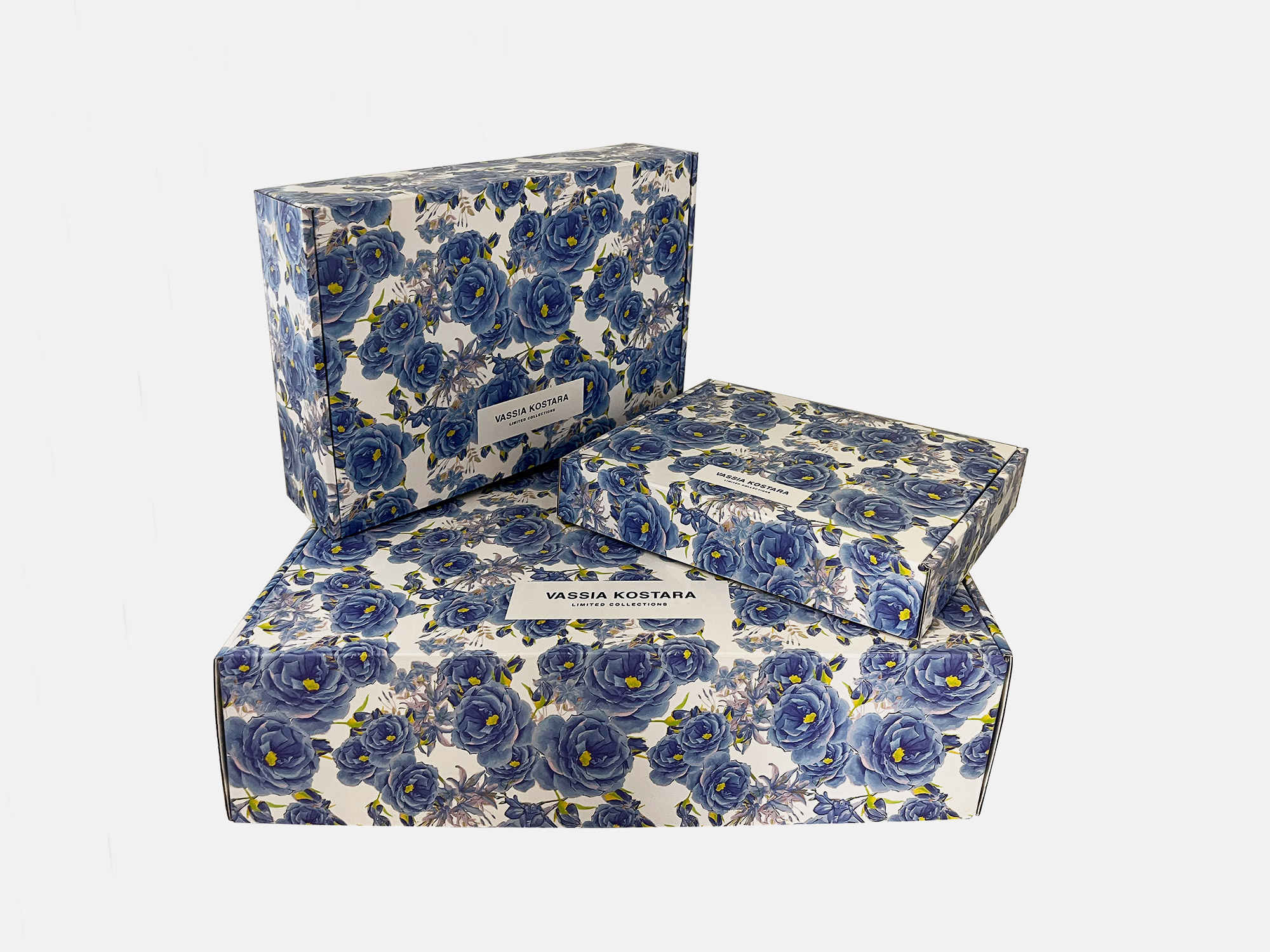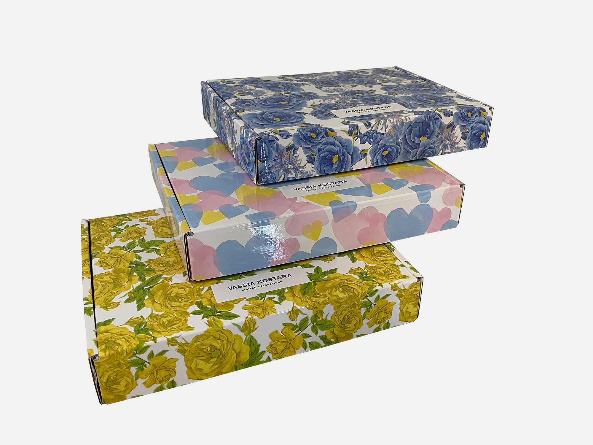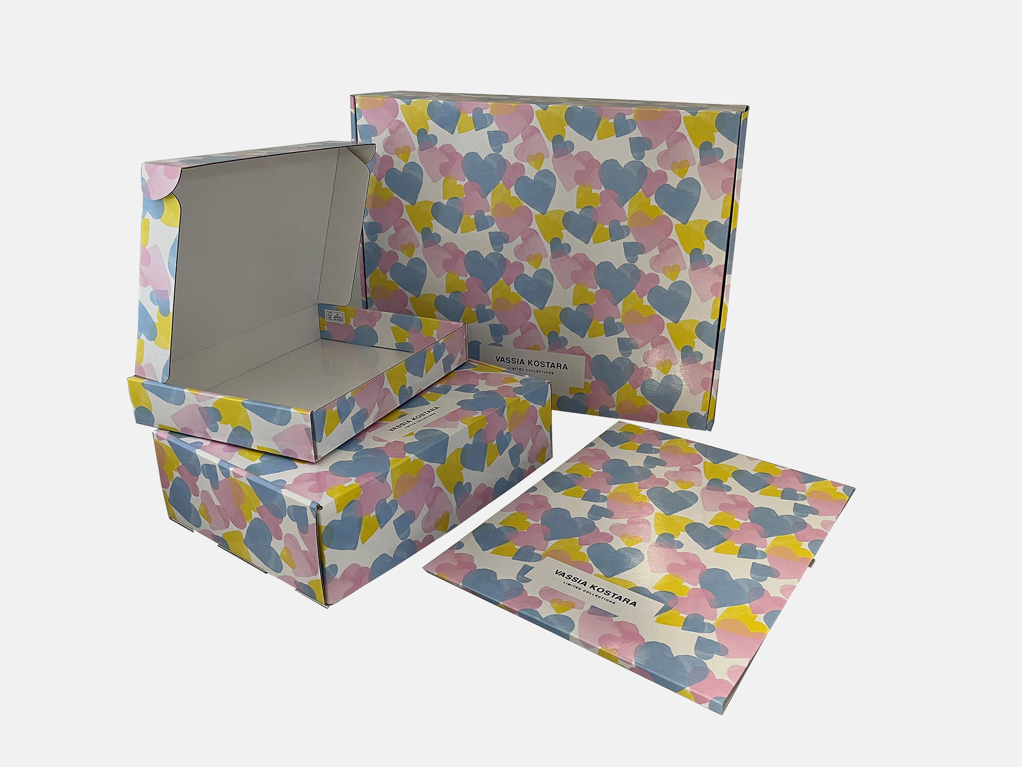 Κουτιά αποστολής από E-flute σε διάφορα μεγέθη και prints. Επενδυμένα εξωτερικά και εσωτερικά με S.Fine με γυαλιστερή ή ματ πλαστικοποίηση. Φάκελος από S.Fine, σε τεσσερα διαφορετικά prints με γυαλιστερή ή ματ πλαστικοποίηση.